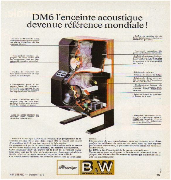 Le B&W DM6 est une enceinte dotée de haut-parleurs spécialement conçus et en avance sur leur temps. B&W a été l'un des premiers fabricants de haut-parleurs à utiliser la modélisation assistée par ordinateur pour faciliter leurs conceptions, et ils ont été les premiers à utiliser du Kevlar tissé comme matériau de cône. Le DM6 a été le premier produit à intégrer ce matériau dans une enceinte commercialement viable, et les résultats ont été très longtemps inégalés.